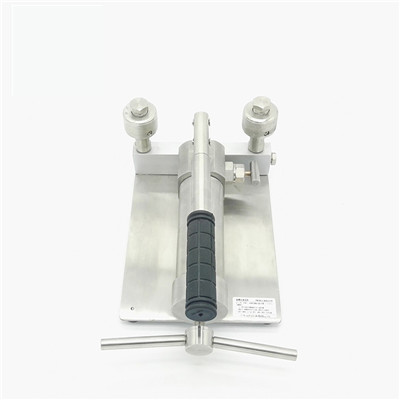 至適當(dāng)位置(中間位置)。向注液口⑹內(nèi)加入造壓介質(zhì),順時針鎖緊泄壓閥⑶,用手壓泵⑷上下抽打加壓(造壓前要將注液口螺母松開,一般手壓泵打壓40MPa左右,再用微調(diào)細(xì)調(diào)至60MPa) 然后再用微調(diào)精細(xì)調(diào)節(jié)(微調(diào)順時針旋轉(zhuǎn)為加壓,逆時針旋轉(zhuǎn)為減壓),泄壓時直接打開泄壓閥門即可泄壓。